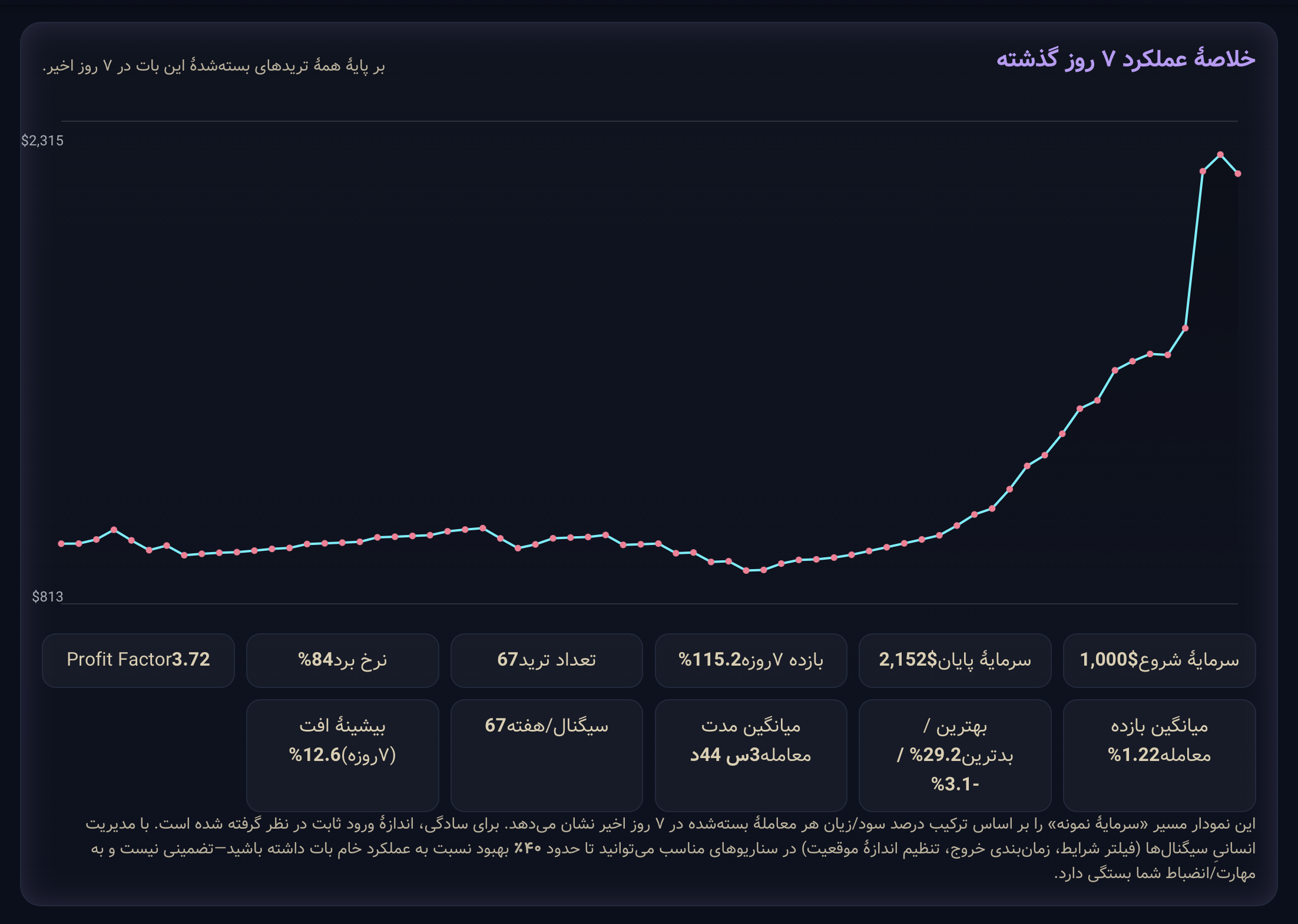 نکتهٔ شفافیت: اعداد عملکرد از داشبورد داخلی ربات گرفته شده اند و صرفاً برای اهداف اطلاع رسانی ارائه می شوند.
